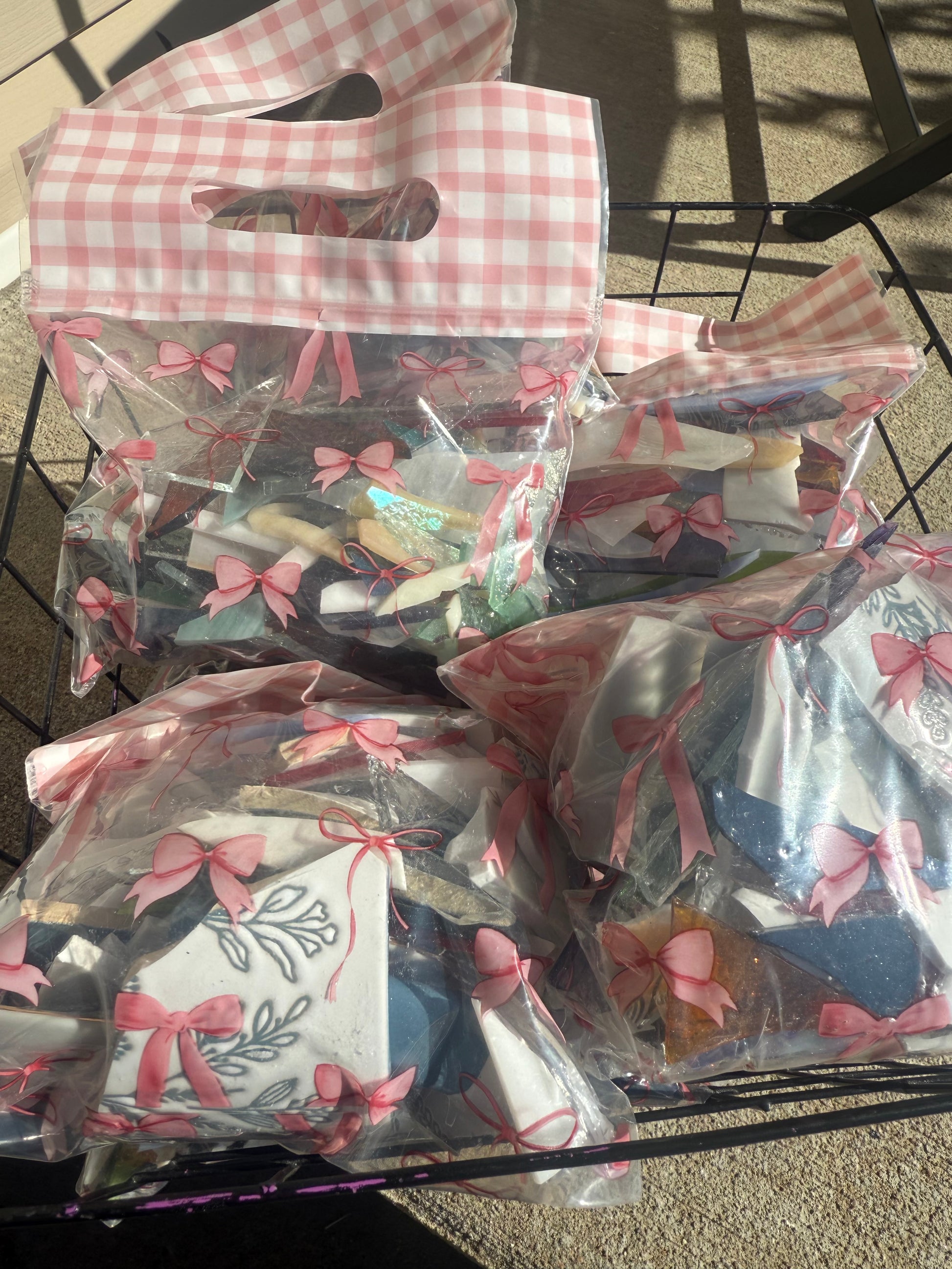 I go off of weight when shipping your order, you will receive various colors/sizes of stained glass scraps and mosaic scraps that are equal to 1LB. We continually add to our pile of glass, so no size, color or shape can be pre-determined.
