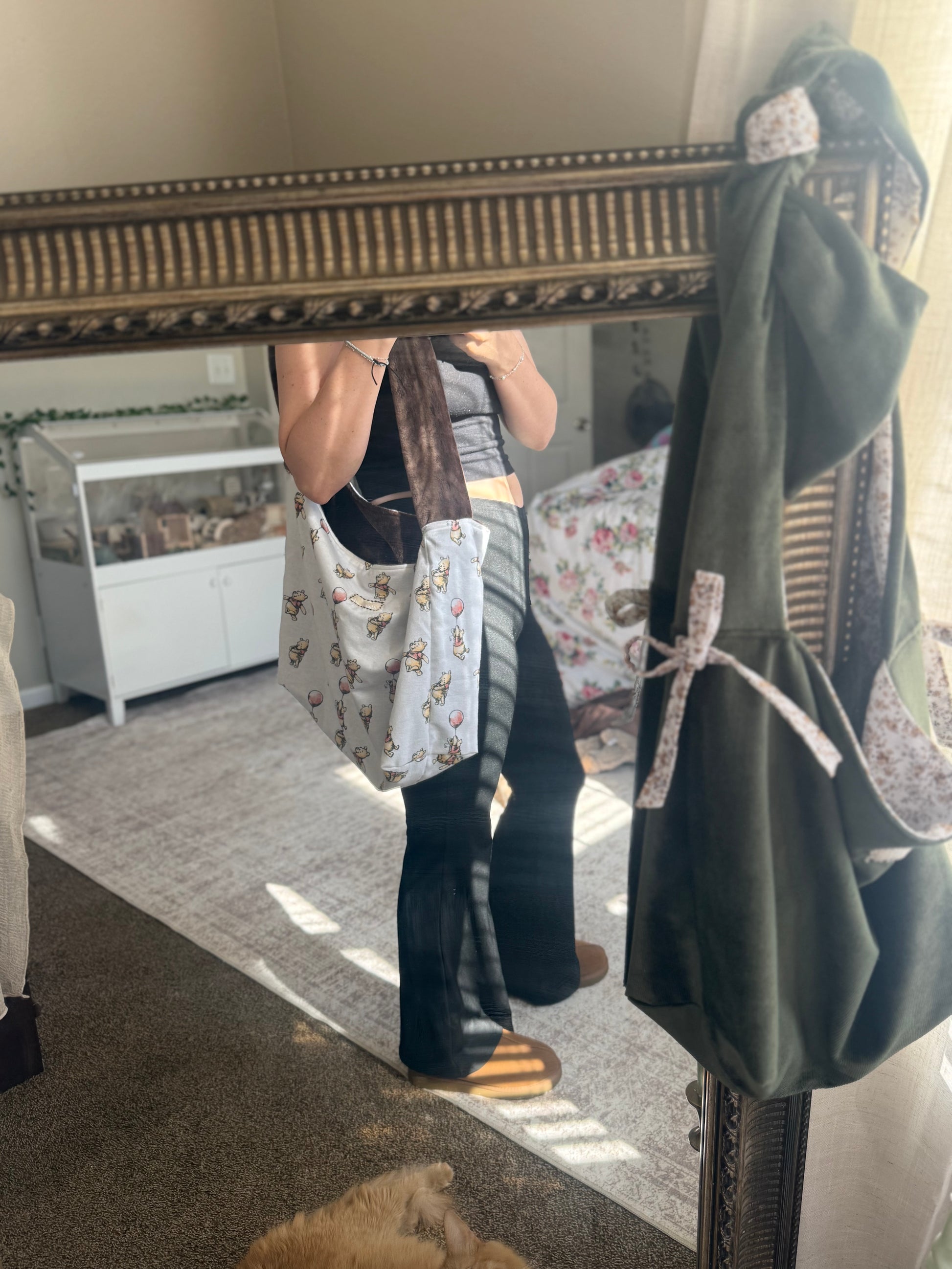 Each tote bag is made with quality cotton fabric and made by hand cutting the fabric and machine sewing/hand sewing in some places. High quality cotton/quilters thread used and in some places embroidery thread for design places. Made with love and care, tote measures approximately 14 inches deep and 16 inches wide with an adjustable shoulder strap.